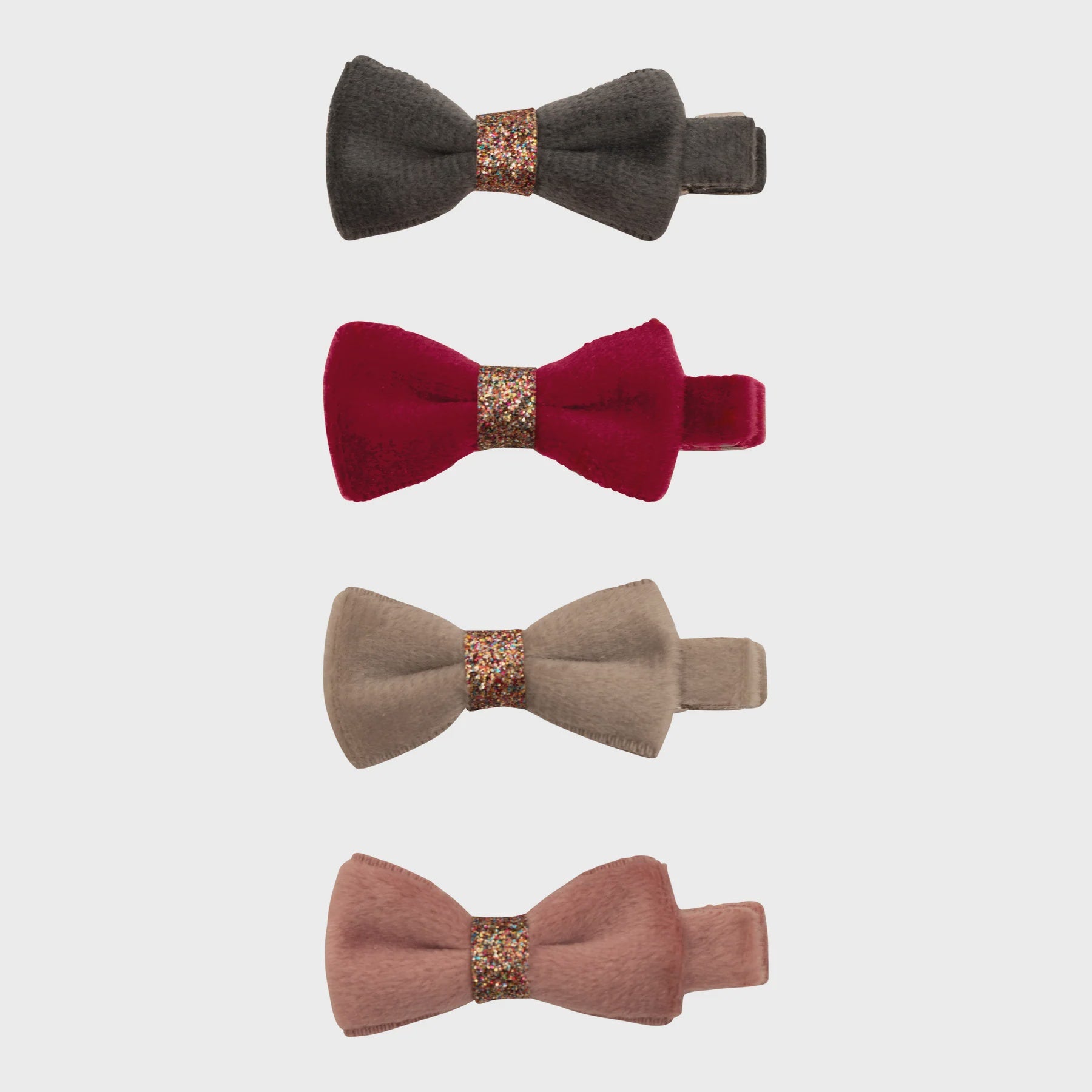 - Bows crafted from soft velvet fabrics with a central glitter wrap