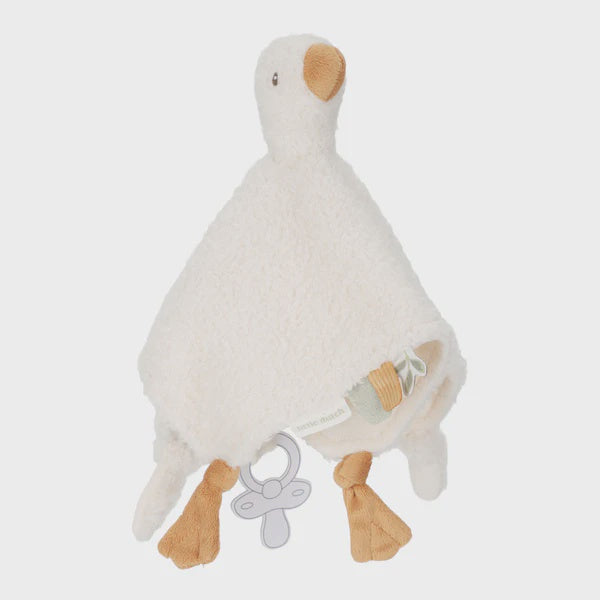 This wonderfully soft little goose will provide your little one with a sense of security as they explore new things and environments, always there for encouragement and comfort. Tiny hands and fingers will love to explore the plush fabric and gentle texture, enjoying endless warming cuddles. With a soft white goose head to share their wildest stories with, a cosy blanket body, and nuzzling knots shaped like webbed feet to rub their faces against and even a little loop to attach a dummy, this little goose is sure to become a firm favourite with your little one.