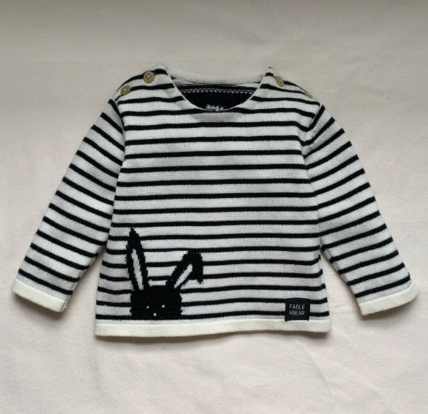 A stripy jumper, featuring little Bunny's face on the front with integrally knitted wording on the back. 'Hop To It!' Functional mock wooden buttons on the shoulder seam.